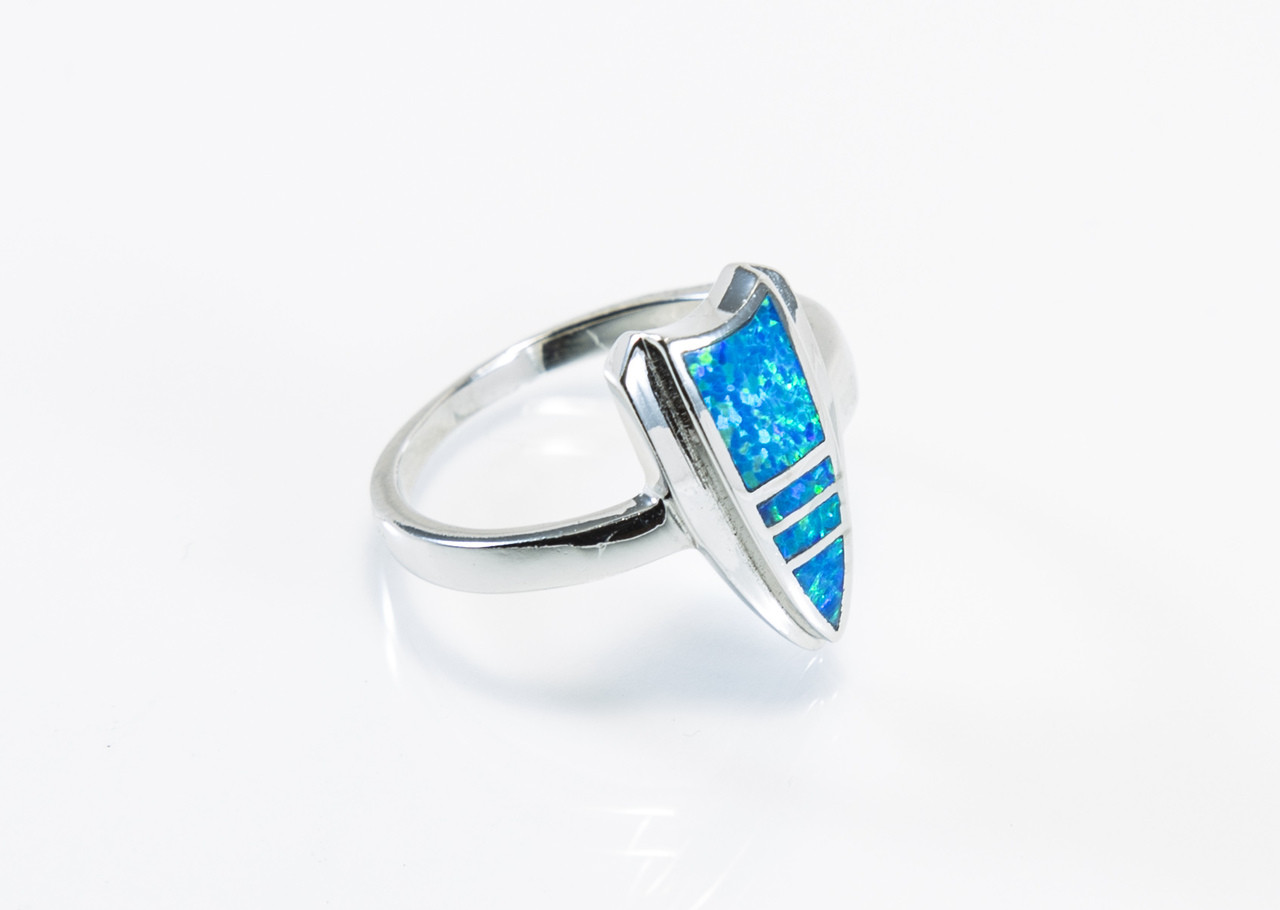 This Sterling silver lab-created opal is an inlaid opal setting, with an arrowhead shape.