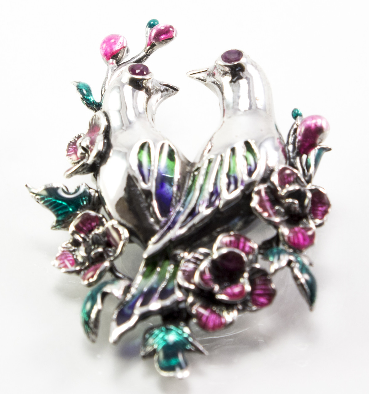 This Sterling silver dual bird enamel pin has 2 beautiful birds with genuine rubies for their eyes, and a pretty enamel design with flowers.