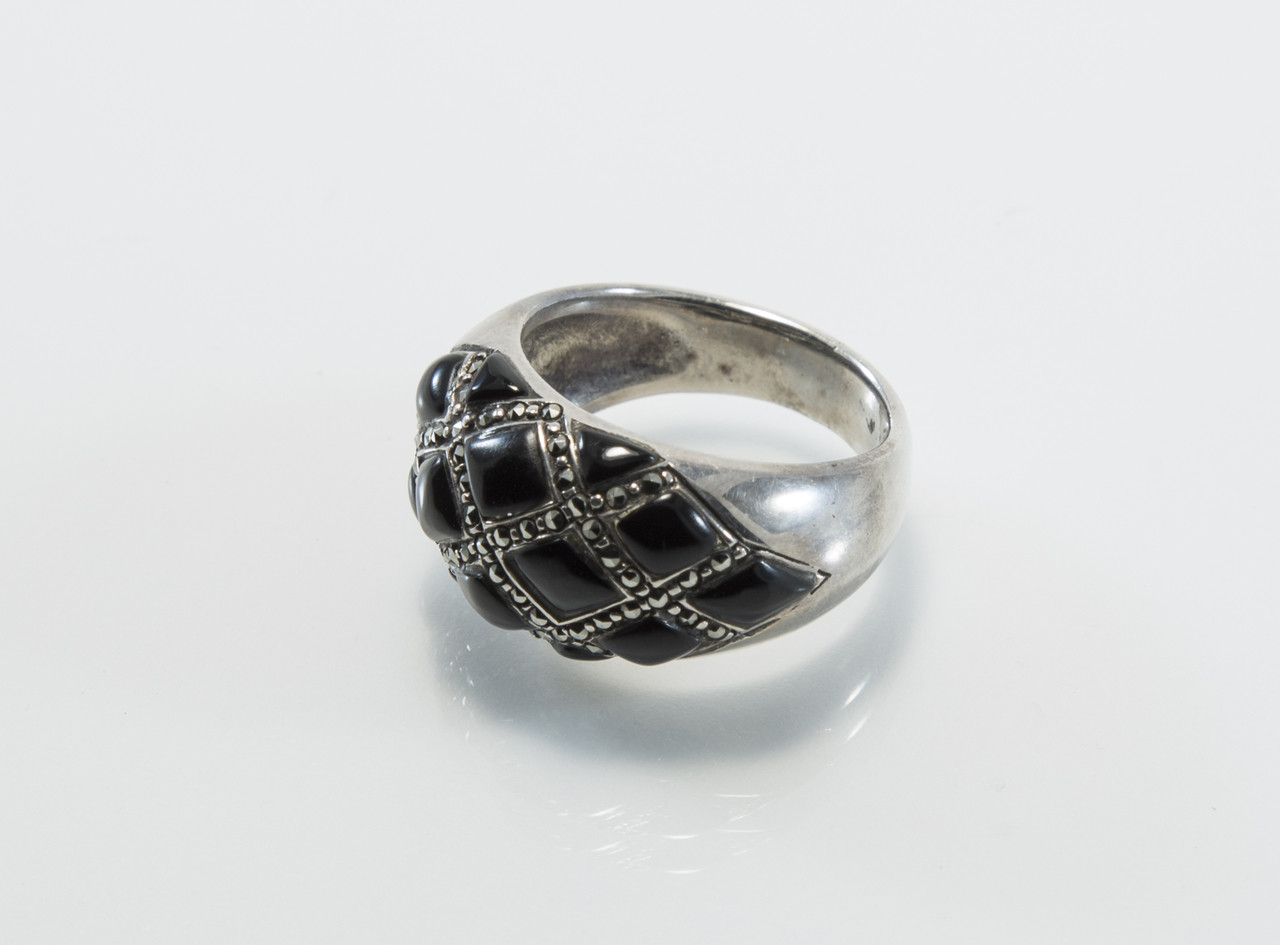 This Sterling silver ring has a unique and exceptional pattern that bursts with natural black onyx and Swiss cut marcasites.