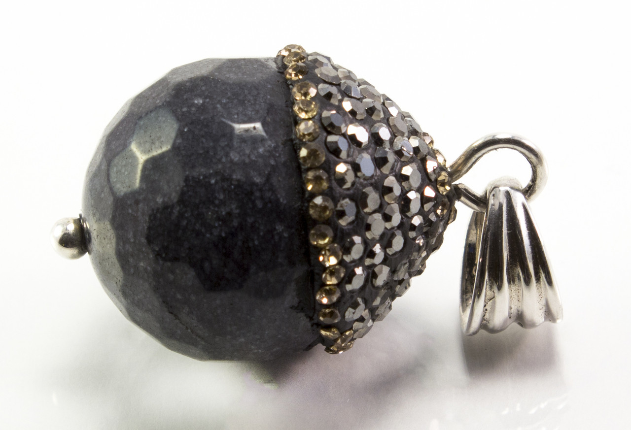 Loading... Please wait... This Sterling silver pendant features a unique dark color blue jade pendant, along with crystals on the top of it.