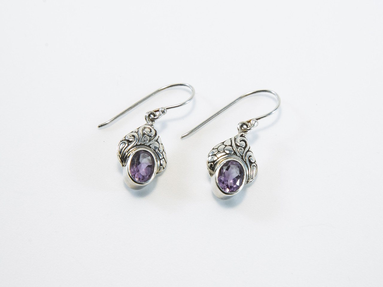 These Sterling silver earrings have two gorgeous, genuine oval-shaped blue topaz or amethyst stones with Balinese scroll work above them.