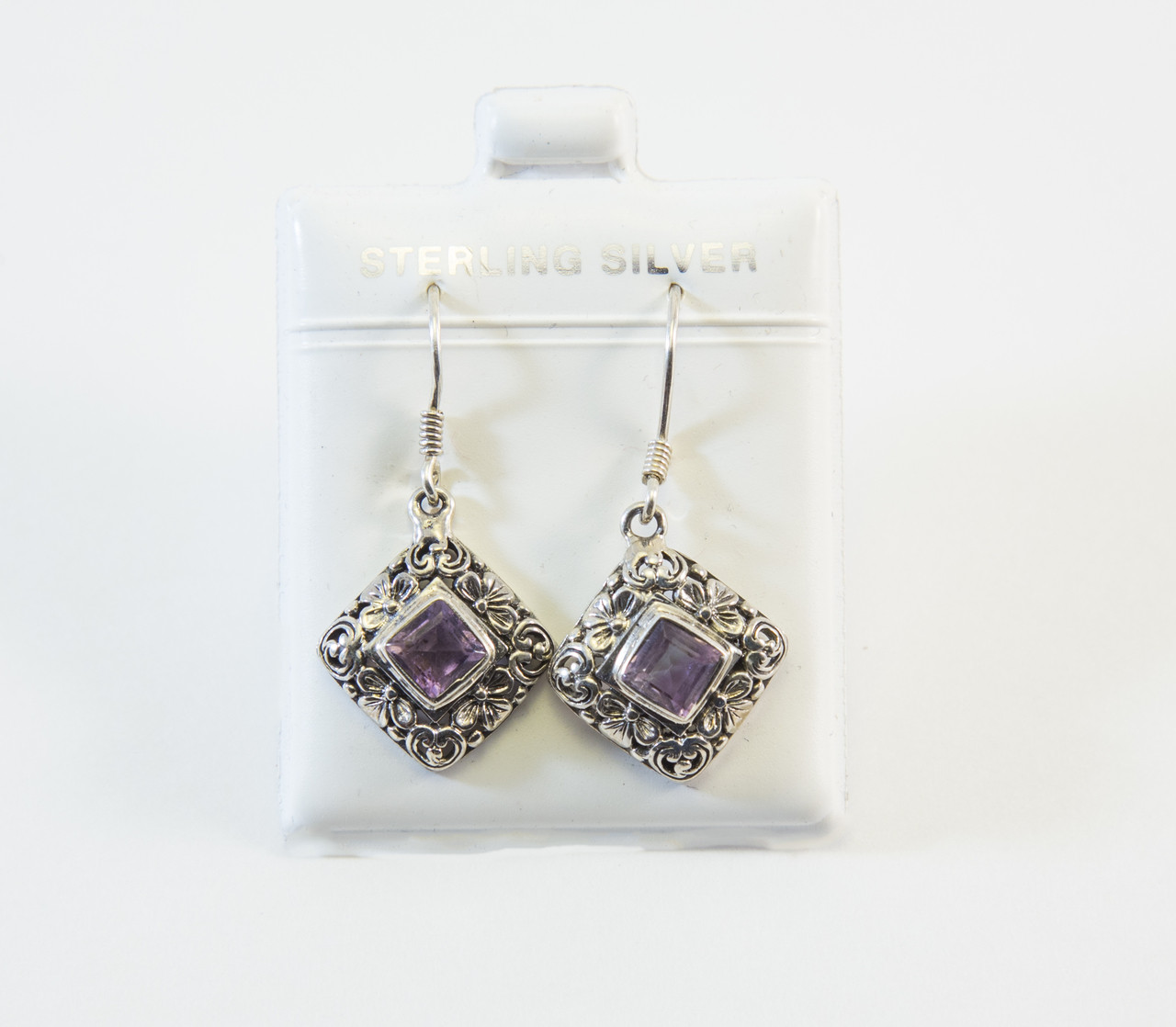 These gorgeous Sterling silver dangling earrings have quintessential Balinese flowery design surrounding genuine diamond-shaped amethysts.