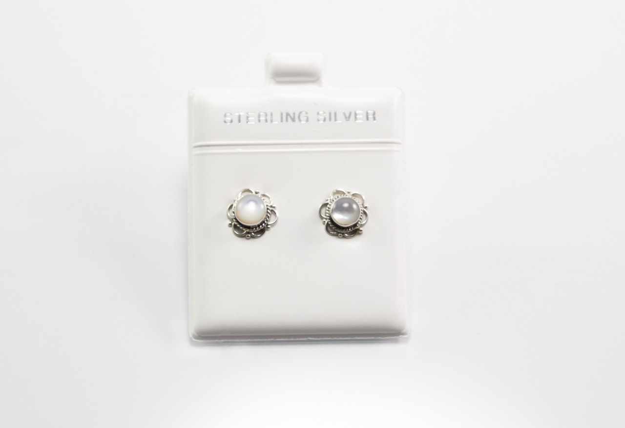 Beautiful Sterling silver mother of pearl stud earrings in the shape of a flower.