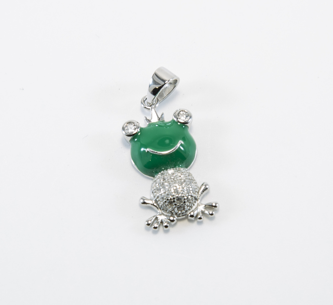 This Sterling silver pendant is a frog head in a green enamel, with the body and eyes being a micro pave cubic zirconia design. It is the right combination of quirky and cool.