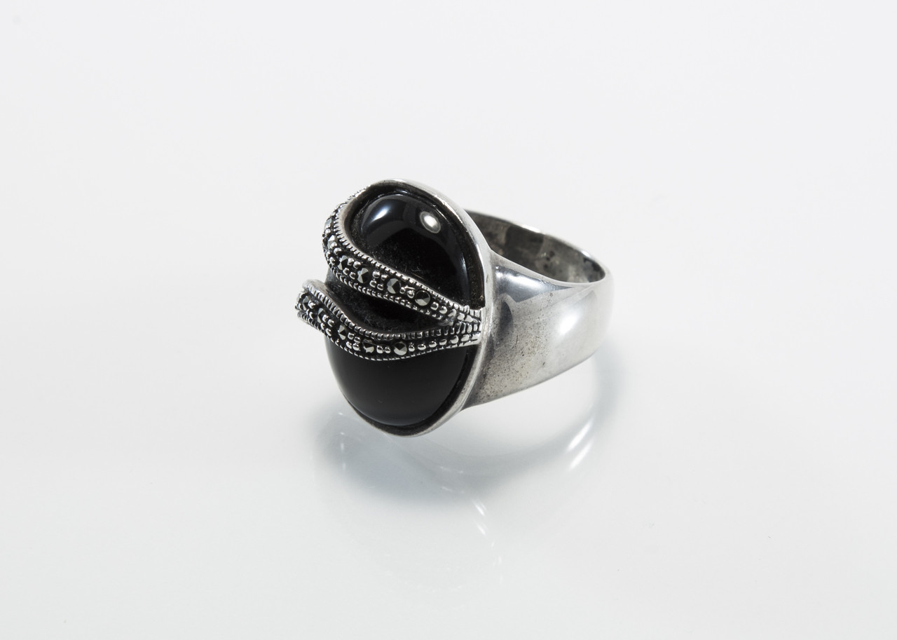 This Sterling silver ring has a beautiful, generously sized oval-shaped black onyx stone, along with Swiss cut marcasites.