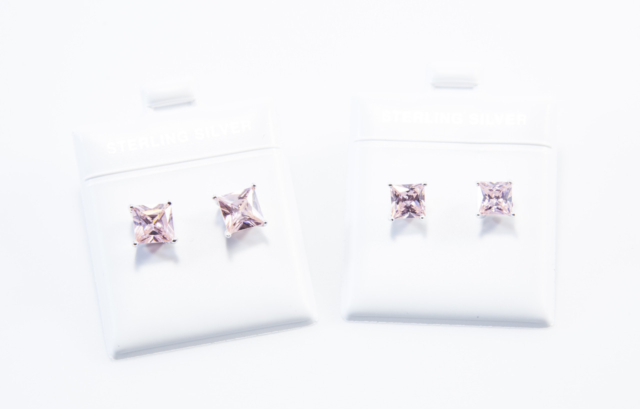 These beautiful Sterling silver pink cubic zirconia earrings are in a princess cut, and come in 6MM or 7MM size.