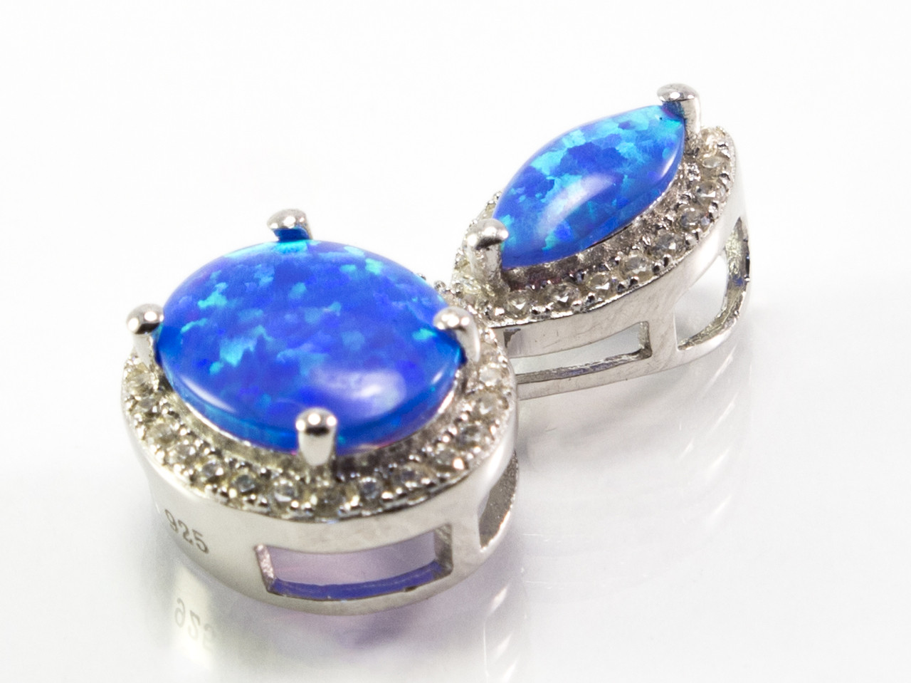 This Sterling silver pendant has 2 lab opal stones, one in a pear-shape and the other in an oval-shape. They are both surrounded by a halo of micro pave cubic zirconia stones.