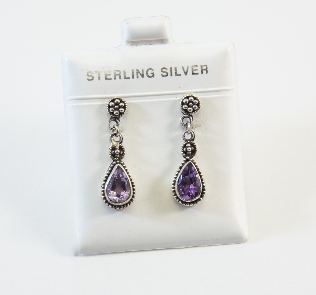 These Sterling silver earrings feature genuine pear-shaped amethysts with Balinese filigree design.