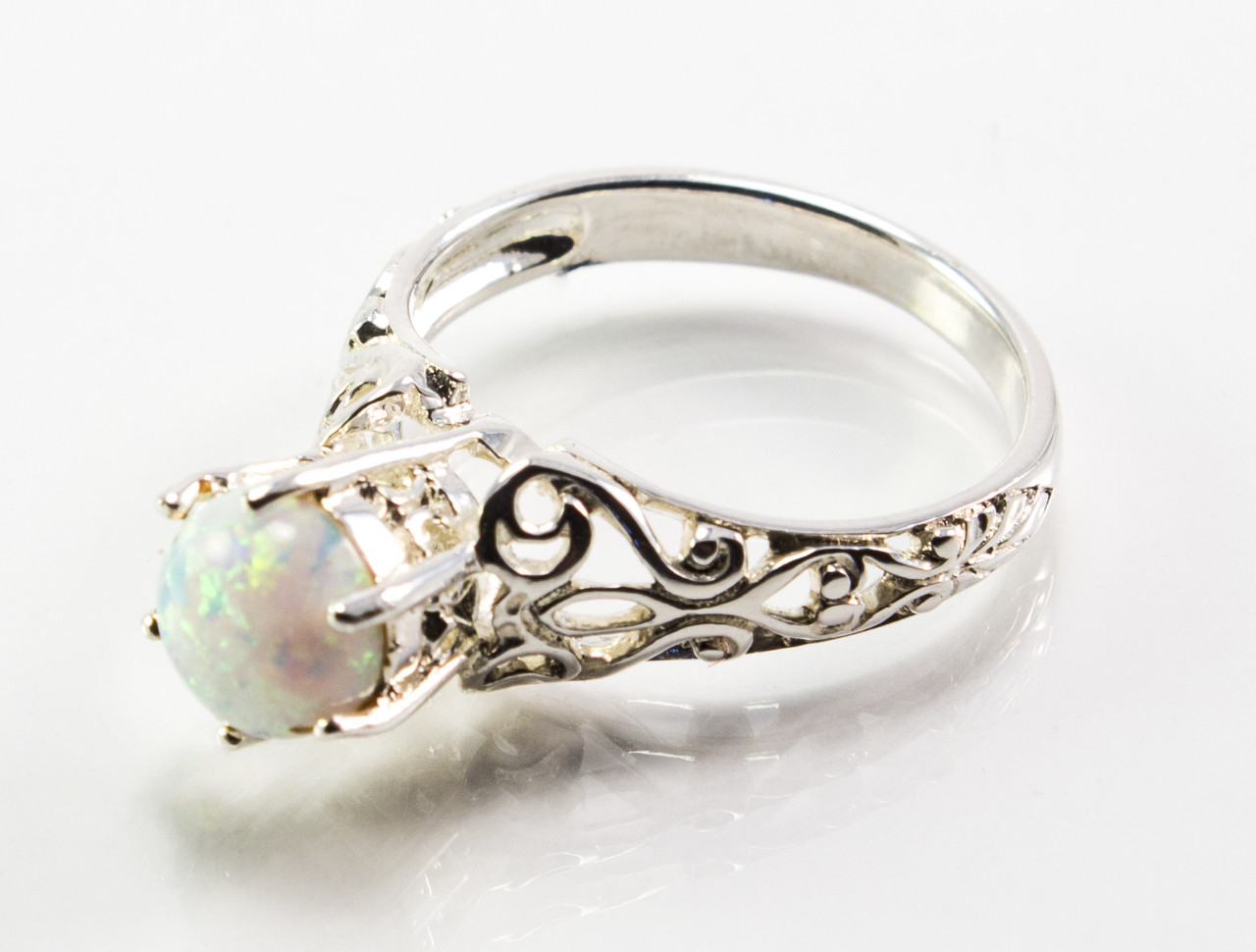 Pronged Round-Shaped White Lab Created Opal with Filigree Ring