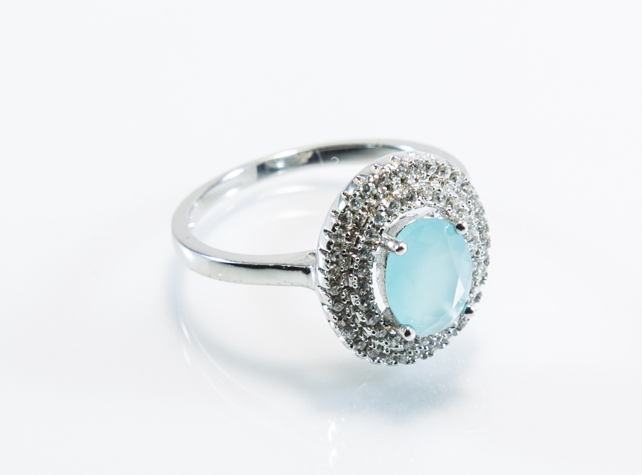 This Sterling silver ring has a genuine chalcedony centerpiece that glows, with a micro pave cubic zirconia design surrounding it.