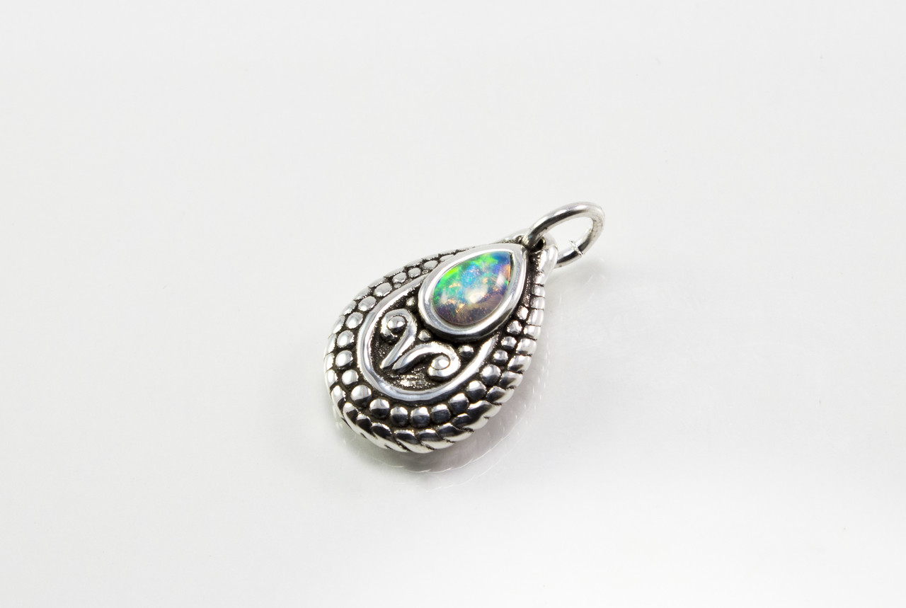 This Sterling silver pendant has a small teardrop-shaped lab opal with beautiful color, and also has granulated dot type pattern in the design.